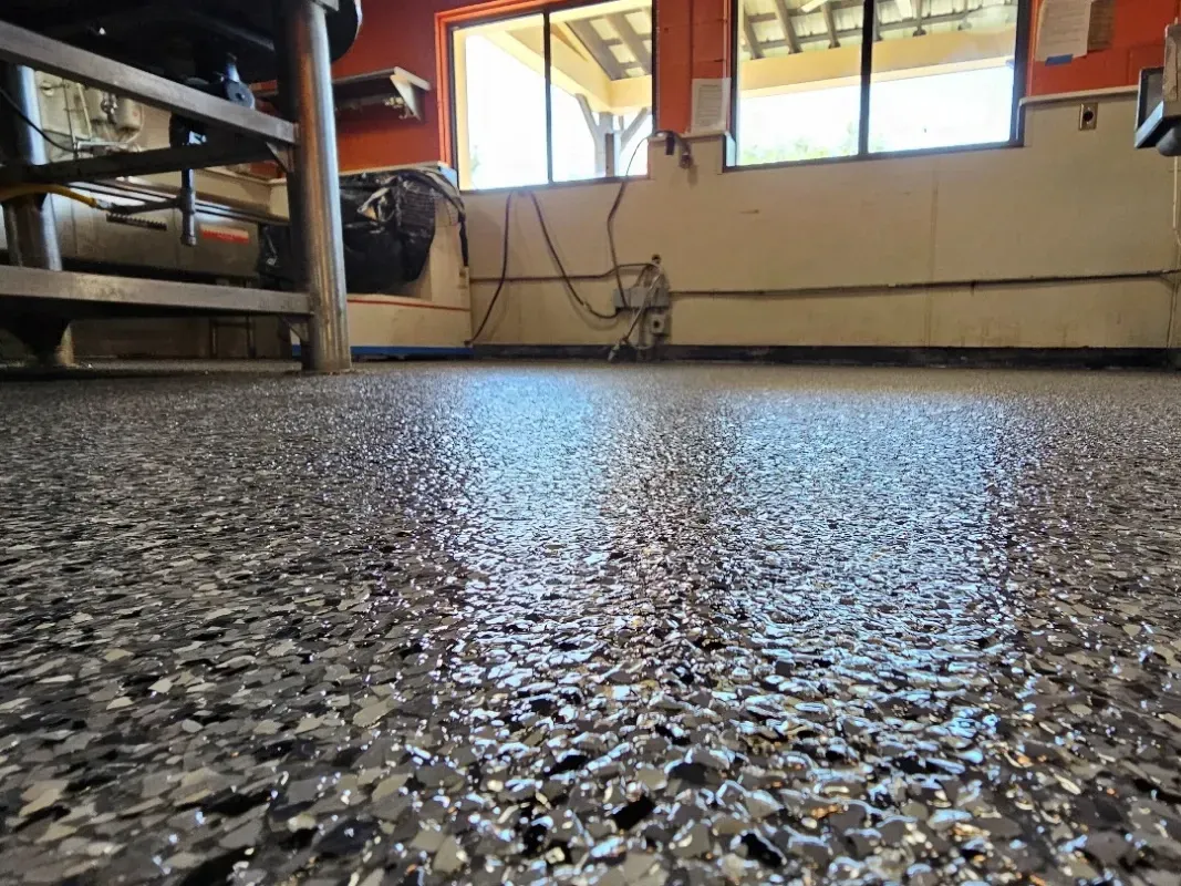 Beyond their impressive durability, flake floors offer a customizable design experience—clients can choose from a wide variety of colors, blends, and flake sizes to achieve a look that perfectly complements their space. The seamless finish resists stains, chemicals, and moisture, making maintenance effortless while preserving a fresh, polished appearance for years.